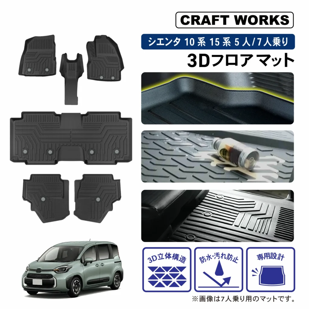 シエンタ専用品として、5人乗り・7人乗りが分かれており、商品ページ上で適合車種や型式が明記されています。車内形状に合わせた立体構造のため、純正マットから交換する目的で選ばれているケースが多い商品です。